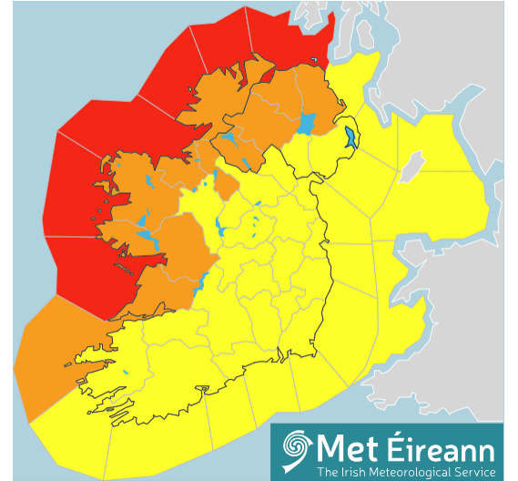 Map of Ireland showing counties shaded in orange and yellow for wind weather warnings